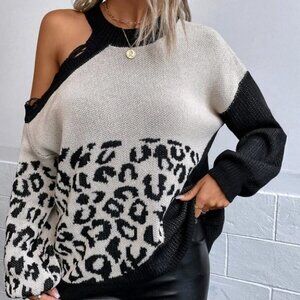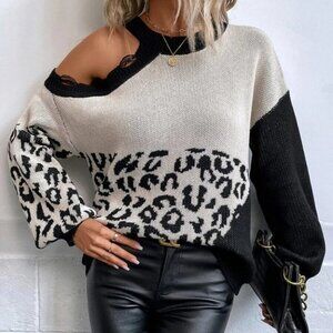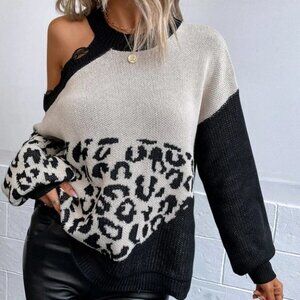Leopard Asymmetrical Neck Distressed Knit Sweater Top