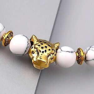 Gold and white beaded leopard unisex bracelet. Stretchable