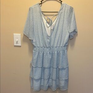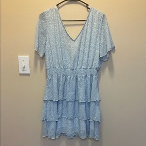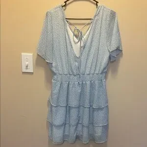 Step out in style with this elegant blue ruffle dress. Perfect for any occasion, this dress features a flattering V-neck and layered ruffles for a chic look.