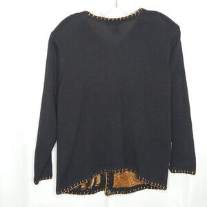 Leopard Cheetah Cardigan Sweater L Black Brown Safari Elephant Embroidered READ