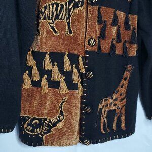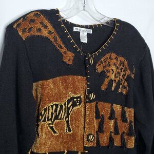 Vintage Dress Barn Lion Cheetah Cardigan Sweater L Black Brown Safari Animals Elephant Giraffe Embroidered Chenille