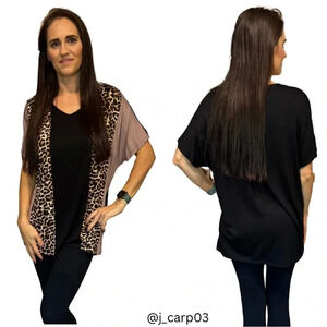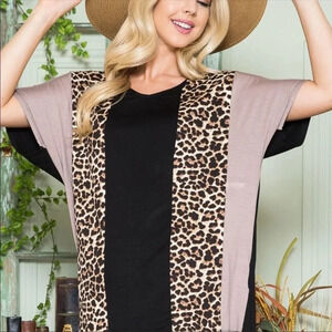 Featuring a trendy mix of taupe, black, and leopard panels, this lightweight, ultra-soft blouse is both flattering and comfy. The V-neckline and relaxed fit make it perfect for everyday wear, work, or a night out.