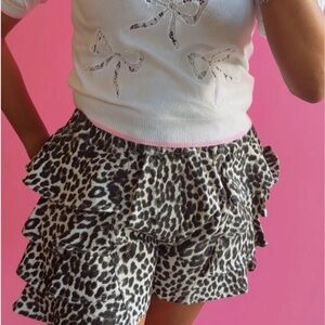 Stylish leopard print ruffle shorts in white and black. Soft, lightweight fabric with layered ruffle detail. Elastic waist for a comfortable, flattering fit. Versatile piece for casual outings and warm-weather looks.