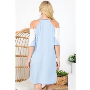 Leopard Detail Blue & White Cold Shoulder Summer Dress with Pockets.