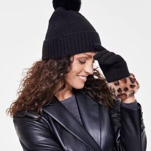 Women's Leopard Faux Fur Trim Gloves with Ribbed Knit Pom Beanie