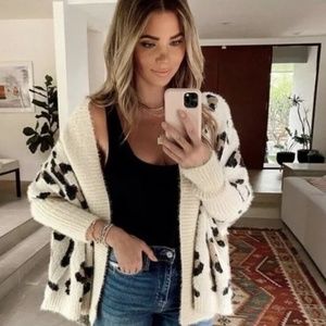 Ivory fuzzy cardigan sweater with leopard animal printed knit design. Oversized fit and open drape style with ribbed cuffs and trim.