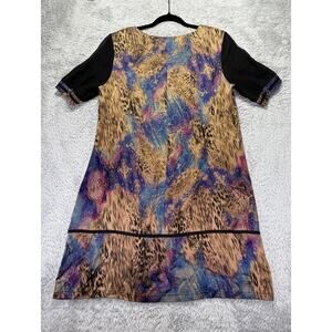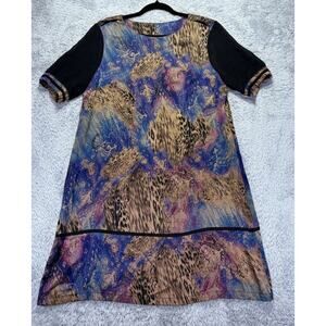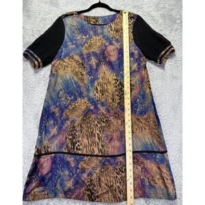 Leopard Gold Blue Print 100% Silk Blend Swing Dress Size XL (Large) Short Sleeve