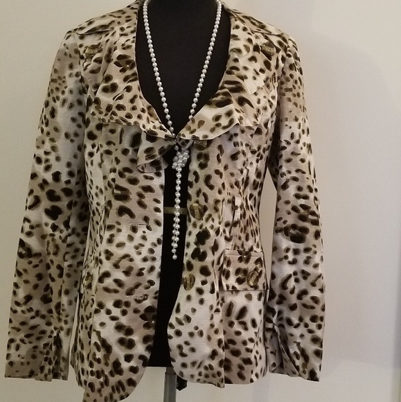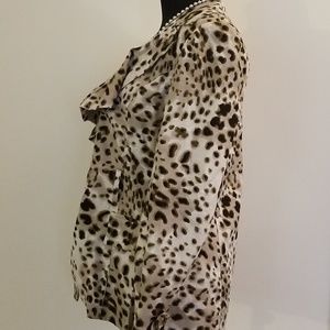 Adorable, leopard light weight jacket, in great condition. 92% silk (necklace not included). Has loop holes as option for a belt. Never worn, in great condition.