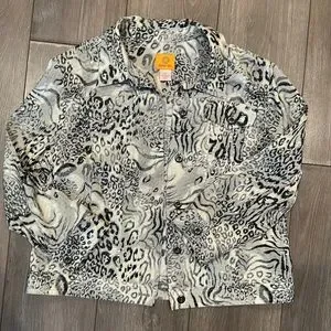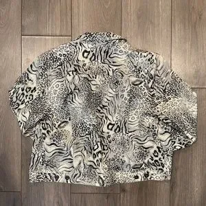 Black, grey, and white colored leopard jacket. Lightweight and is probably more to be used as a fashion jacket than a jacket for warmth.