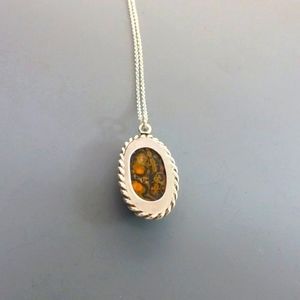 Gorgeous multicolored (black, tan, pink) leopard jasper cabochon set in a handcrafted sterling silver bezel with twisted wire edging, strung on 20" sterling 1mm cable chain. Pendant measures 1" in length and a bit over 1/2" in width. Gift box included!