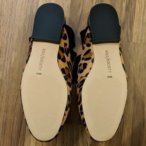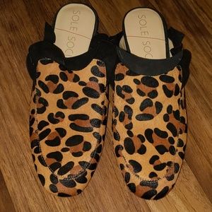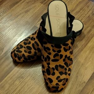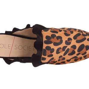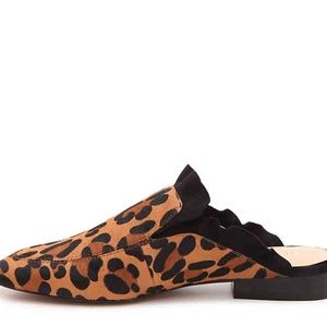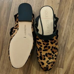 These leopard mules from Sole Society have a cute ruffle trim, calf hair upper, round toe, faux leather lining, and lightly padded footbed for comfort.