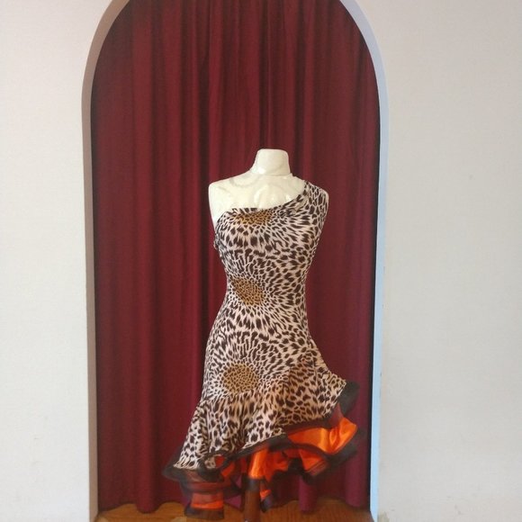 One shoulder with striped orange strappy back. Bottom is flared with leopard and orange layers lined with black.