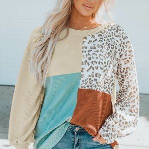 Leopard Patchwork Color Block Ribbed Long Sleeve Top