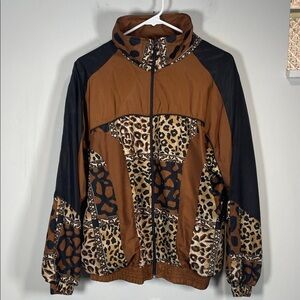 Elevate your style with this chic windbreaker jacket featuring a striking leopard patchwork design. Perfect for a bold fashion statement.