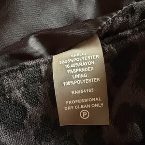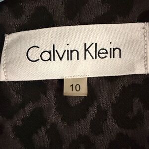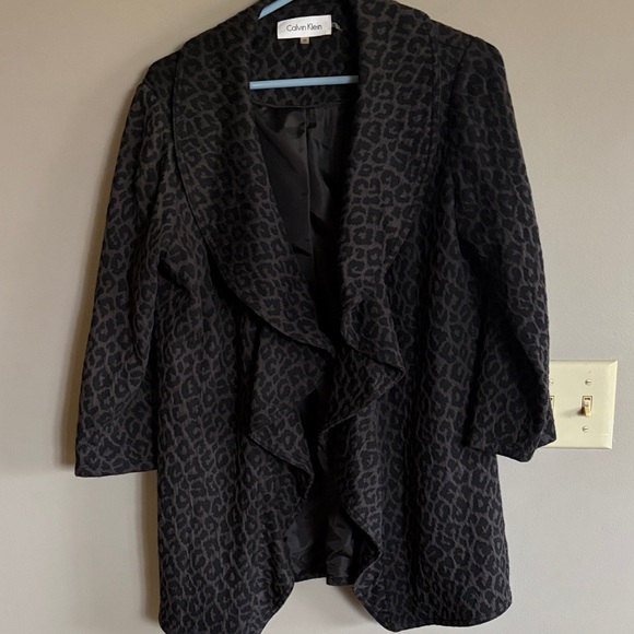 Elegant Calvin Klein Blazer with a charcoal and black leopard pattern. Features 3/4 length sleeves and a ruffle lapel. Adds sophistication to any look. In great used condition from a smoke free-dog friendly home.