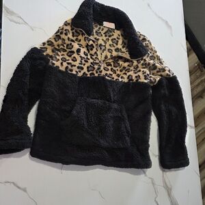 Warm fleece jacket with a leopard pattern. Features a soft black interior.