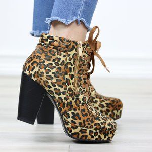 Leopard Platform Ankle Boots High Heel Leopard Faux Suede Lace-Up Block