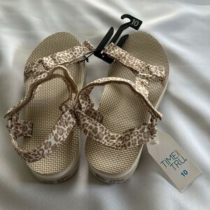 This is new with tags. Medium width. Fabric uppers, the balance is man made. The color is tan. Adjustable straps. The rise is 1.5 inches.