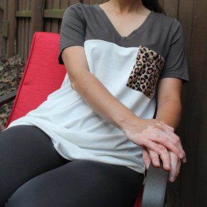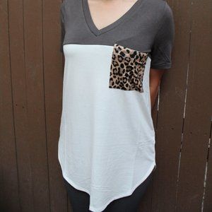 Leopard Pocket Color-block V-Neck Short Sleeve