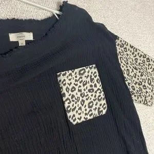 Black tee with leopard detail. Has cute distress around neck and waist. Very soft. Size M but fits like a small