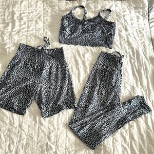 Stylish Leopard Print 3 pcs Activewear Set featuring a comfortable top and matching bottoms, short and long. Perfect for a cozy workout, casual wearing and more.