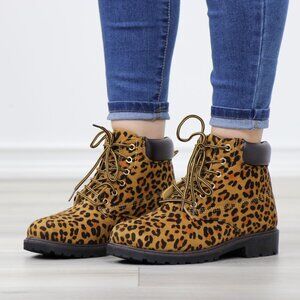 Leopard Print Ankle Boots Lace-Up Faux Nubuck Combat Rugged Sole