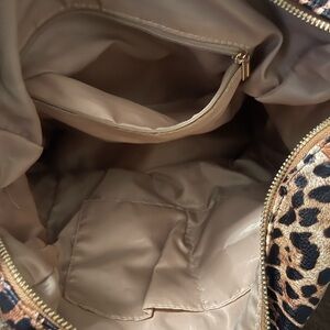 Stylish leopard print backpack with multiple zippered pockets. Perfect for everyday use.