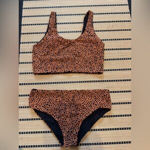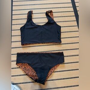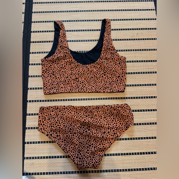 Stylish leopard print bikini. Features a scoop neck top and matching bottoms. Perfect for beach days. Reversible!