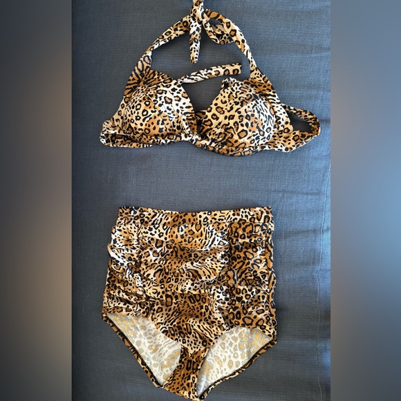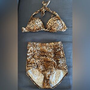 Stylish leopard print bikini set. Features a bold animal pattern. High waisted bottoms. Never worn