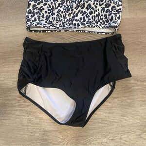 Stylish leopard print bikini top with black high-waisted bottoms. Perfect for a chic beach look.