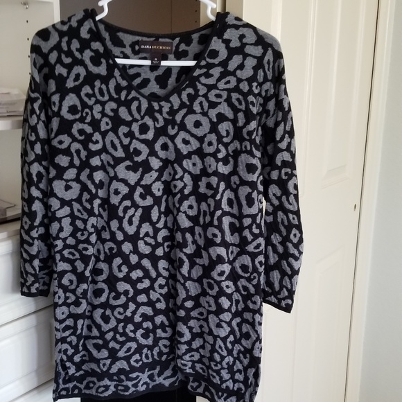 Black and grey color. 3/4 sleeve. From shoulder to bottom of the back of shirt is about 28". EUC... only worn a couple of times. Great with leggings and boots.