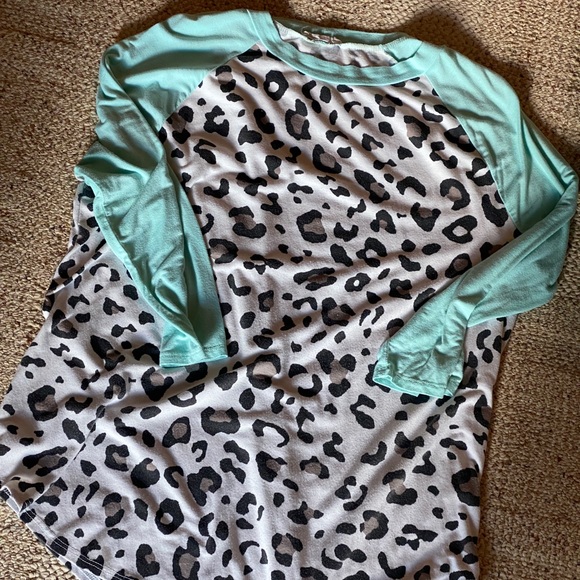 Leopard print & teal blouse. I got so many compliments in this blouse, but it’s too big on me now. My loss; your gain. The size tag isn’t in it anymore, but it definitely fit like a 2X.