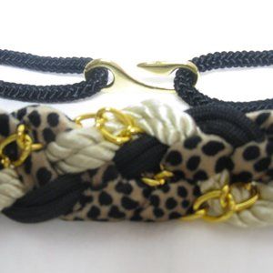 Pearly white satin cord, black woven cord, beige black leopard print velveteen strips interwoven with gold chain.