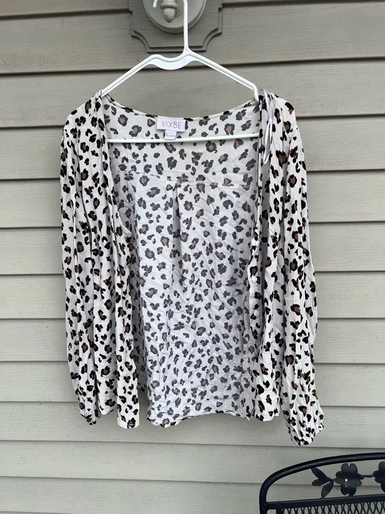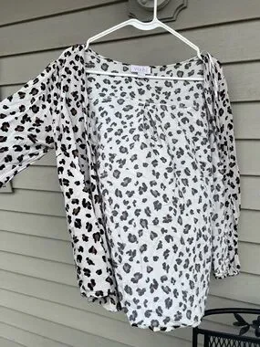 lightweight open-front button up in white with brown and black leopard spots. Soft, breathable fabric for easy layering. Versatile style that pairs with tees, tanks, or dresses for a polished casual look. Only worn maybe twice. Can be worn buttoned up or open for a cardigan style.