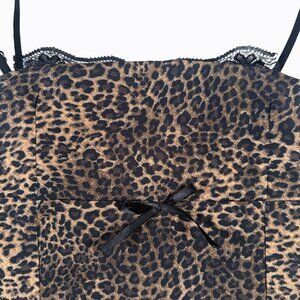 This captivating leopard print cami crop top features a flattering corset-style silhouette in a striking brown and black leopard/cheetah print. The sweetheart neckline is delicately trimmed with lace and accented by a charming bow at the bustline. With adjustable spaghetti straps for a tailored fit and a lightweight, breathable feel, it sits perfectly at the waist.