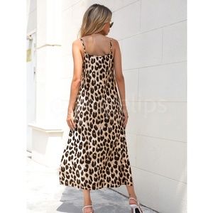 Leopard Print Cami Dress Leg Slit Tan Black Animal Cheetah