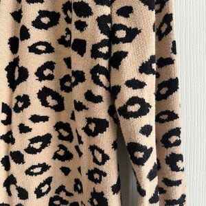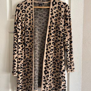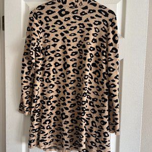 Leopard Print Cardigan. Perfect with a black tank, turtleneck, or t-shirt and jeans with some Dr. Martens. Because of the strong black presence you could also do black leggings and pop it with a white or colored t-shirt that is flattering for your skin tone. Size M (Slightly oversized in my opinion so would fit a large or a medium that likes cardigans roomy.)