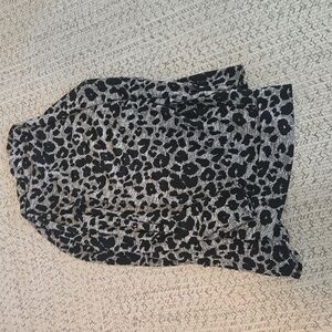 Stylish leopard print cardigan. Features a chic black and gray pattern.