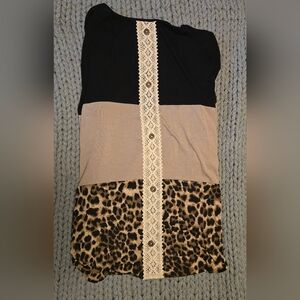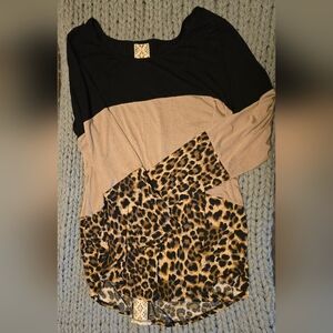 Stylish women's top featuring a bold leopard print and color block design. Perfect for adding a touch of flair to your wardrobe.