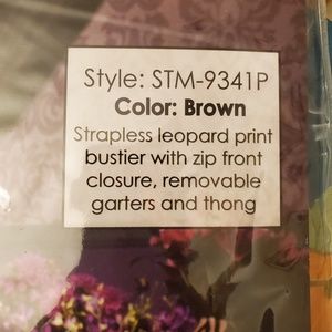 Includes: Strapless Leopard Print Bustier with Zip Front Closure, Removable Garters & Matching Leopard Print Thong.