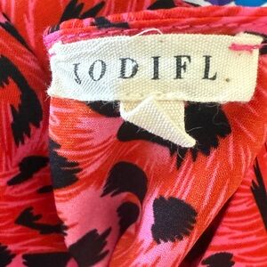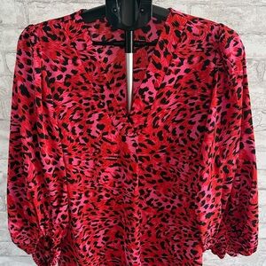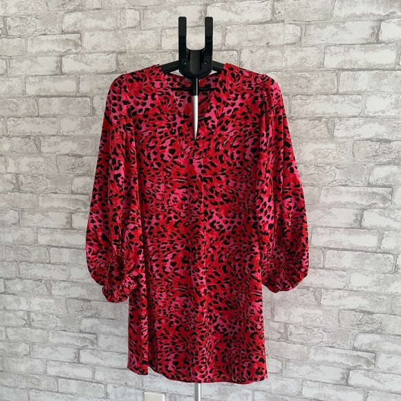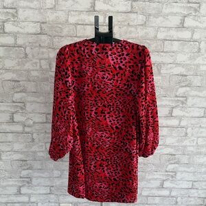 Bold red and pink dress with striking animal print. Features sleeves and a relaxed fit. Perfect for a chic look.