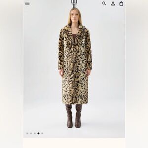 Stylish leopard print faux fur coat. Perfect for a bold fashion statement. Features a long, elegant design.