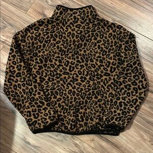 Stylish leopard print fleece pullover. Features a half-zip design. Perfect for a cozy and fashionable look.