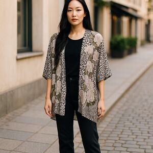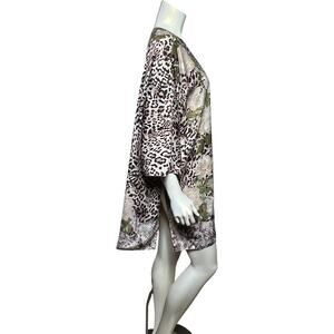 Stunning open-front kimono cardigan featuring a luxurious leopard print pattern with elegant white rose floral accents and green foliage. This lightweight, flowy cover-up has wide 3/4 sleeves with a dramatic drape for a flattering silhouette. The hem features a complementary snakeskin print border for added visual interest. Perfect as a swimsuit cover-up, festival wear, or a lightweight layer over tanks and jeans. The versatile style transitions effortlessly from beach to brunch. No closure - designed to be worn open. The soft, silky fabric creates an elegant drape that elevates any outfit. Approximately size medium, with a relaxed, one-size-fits-most styling that works for various body types. approx. measurements taken laying flat and undoubled: