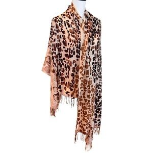 Leopard Print Fringe Scarf Wrap Shawl Neutral Tan Brown Animal Print