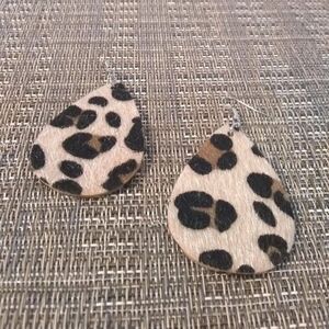 These earrings are made of leopard print faux leather, a material that has a soft fur texture and a wild and trendy pattern. The faux leather is cut into teardrop shapes that are flattering and versatile. The earrings have the same leopard print on both sides, so they look great from any angle. The earrings have a dangle of approximately 3 inches, making them bold and eye-catching. These earrings are a perfect way to spice up your outfit with some animal print flair.