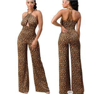 Show your wild side in this satiny soft jumpsuit! This jumpsuit features a bold chain halter neckline, a flirty keyhole opening, and hidden zip closure. Style with a stappy pump and a fun clutch for a complete look!