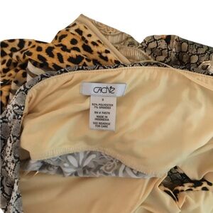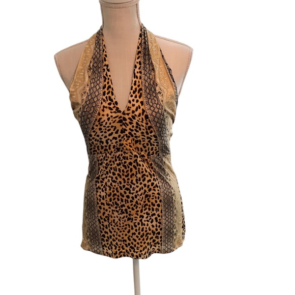 Stylish leopard print halter top with a deep V-neck. Features a mix of animal and geometric patterns in tan and black.