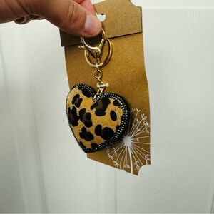 Stylish leopard print heart keychain with gold accents. Perfect for adding a touch of elegance to your accessories.