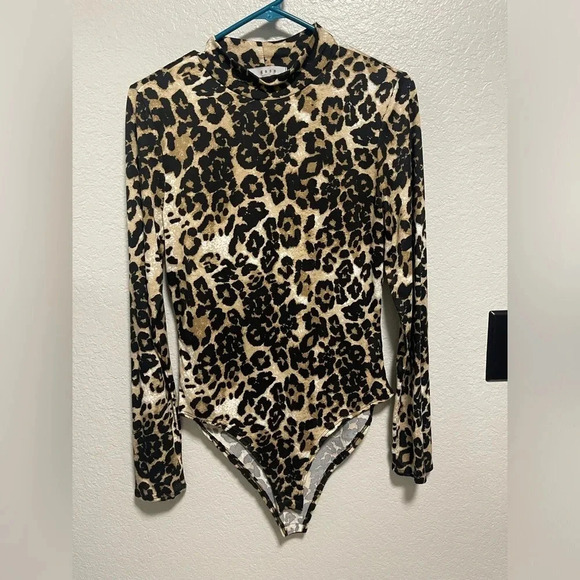 Leopard Print High Collar Long Sleeve Bodysuit Large